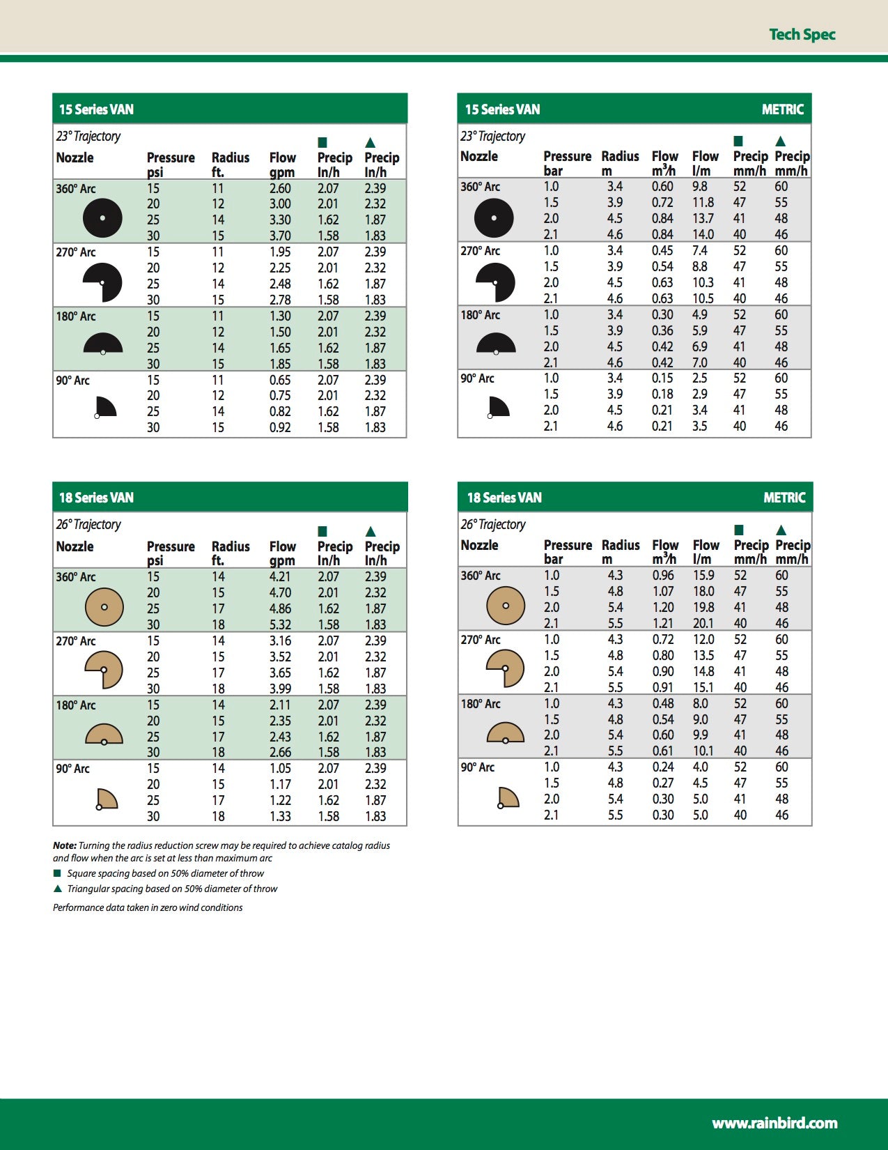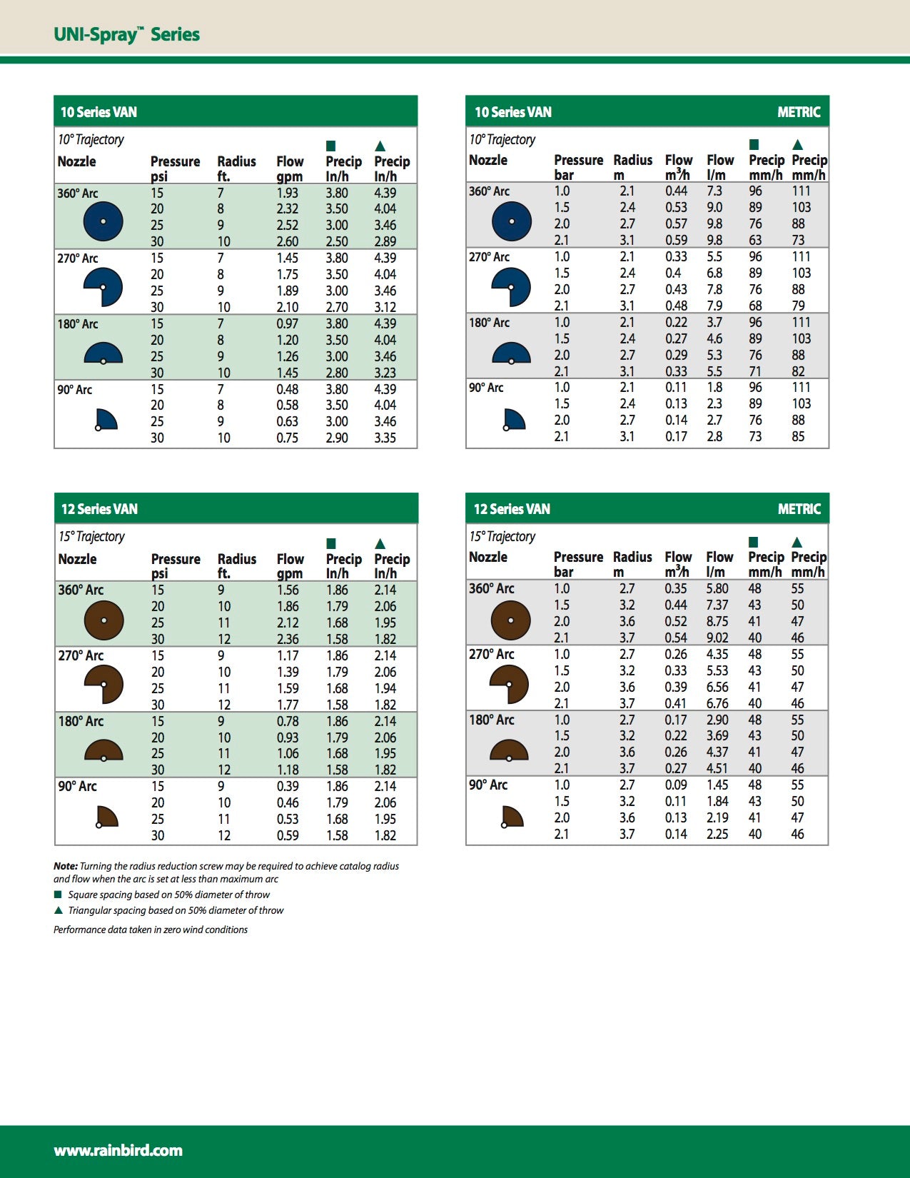• Codificadas en la parte superior por colores, para identificar rápidamente el alcance y el sector • Ajuste fácil del sector desde 0° a 360° para 10, 12, 15 y 18-VAN; 0° a 330° para 4, 6 y 8-VAN. • Se suministran en bolsas con auto cierre por separado, una bolsa para las toberas y otra bolsa para los filtros Presión: 1 a 2,1 bares* |