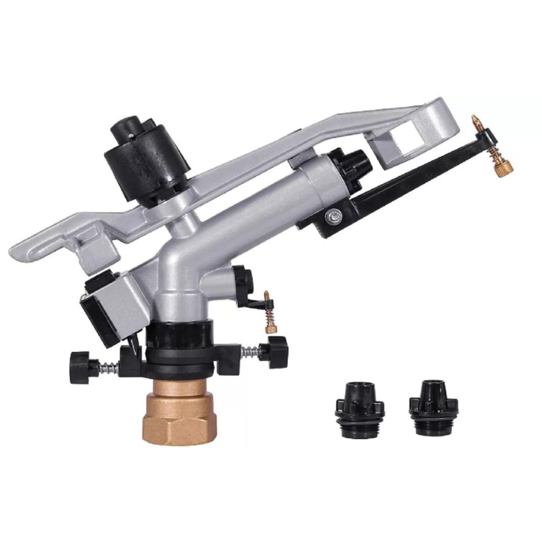 Mini-cañon de impacto muy versátil y práctico, riega en círculo parcial y completo, los anillos (seguros) de la base puede aflojarlos y mantenerlos abajo para regar a círculo completo, en cambio si necesita regar a círculo parcial deberá subir, ajustar el sector deseado (90°, 180° 270° u otro ángulo) y apretar los seguros. Cuenta con quebrachorro en cada boquilla, principal y secundaria y lo puede ajustar para dispersar más o menos el chorro según lo desee.
